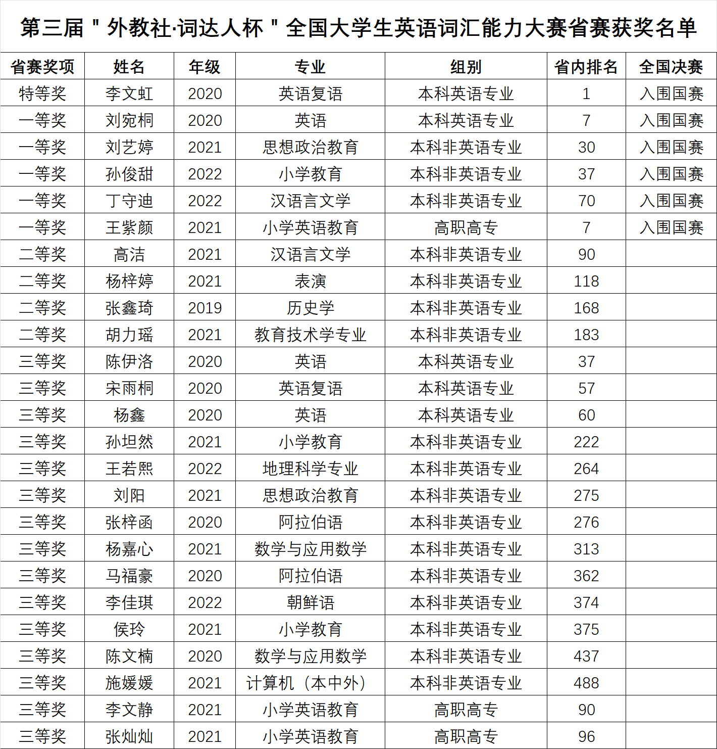 近日,第三届“外教社·词达人杯”全国大学生英语词汇能力大赛省赛举行,我校136名学生入围省赛,其中外国语学院李文虹同学获特等奖,外国语学院刘宛桐、马克思主义学院刘艺婷等5名同学获一等奖,文学院高洁、音乐学院杨梓婷等4名同学获二等奖;外国语学院陈伊洛、教育学院孙坦然等15名同学获三等奖。