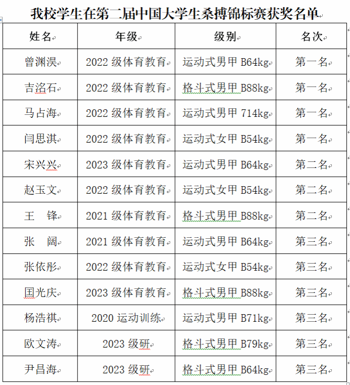 学校高度重视此次锦标赛,体育学院为参赛选手提供了良好的保障条件,教练员指导严格要求,参赛选手敢于拼搏,团队协作和谐高效。体育学院13名本硕学生组成桑搏代表队,参加了格斗式和运动式桑搏2个项目13个级别的角逐,展示出了我校桑搏代表队敢打敢拼、自信果敢的风采,以及在中国大学生桑搏锦标赛甲B组的优势地位。