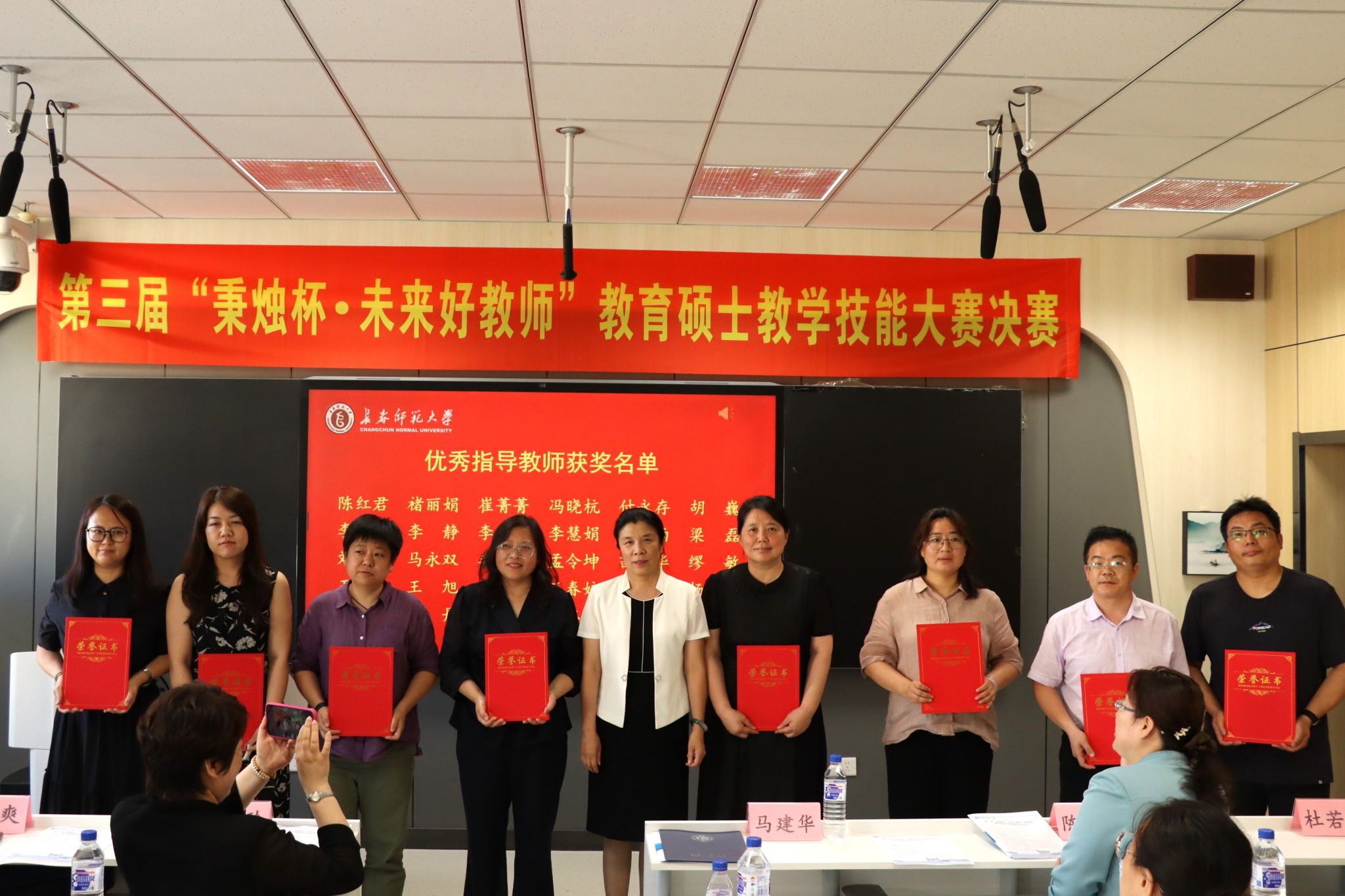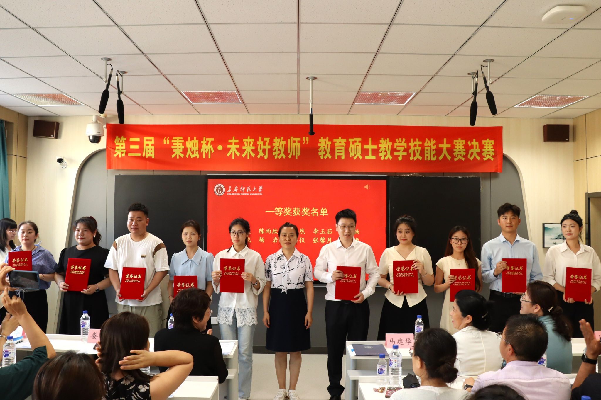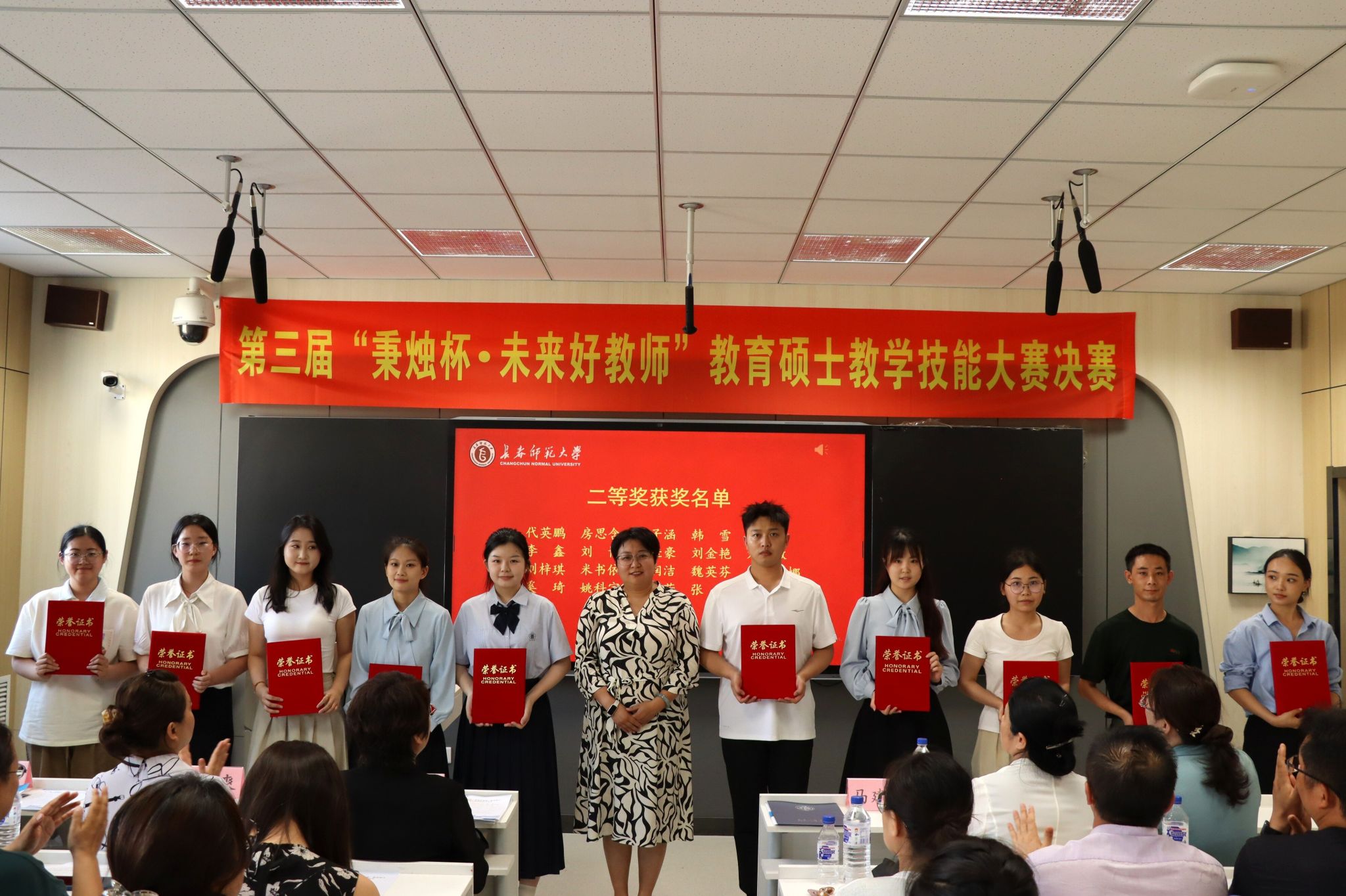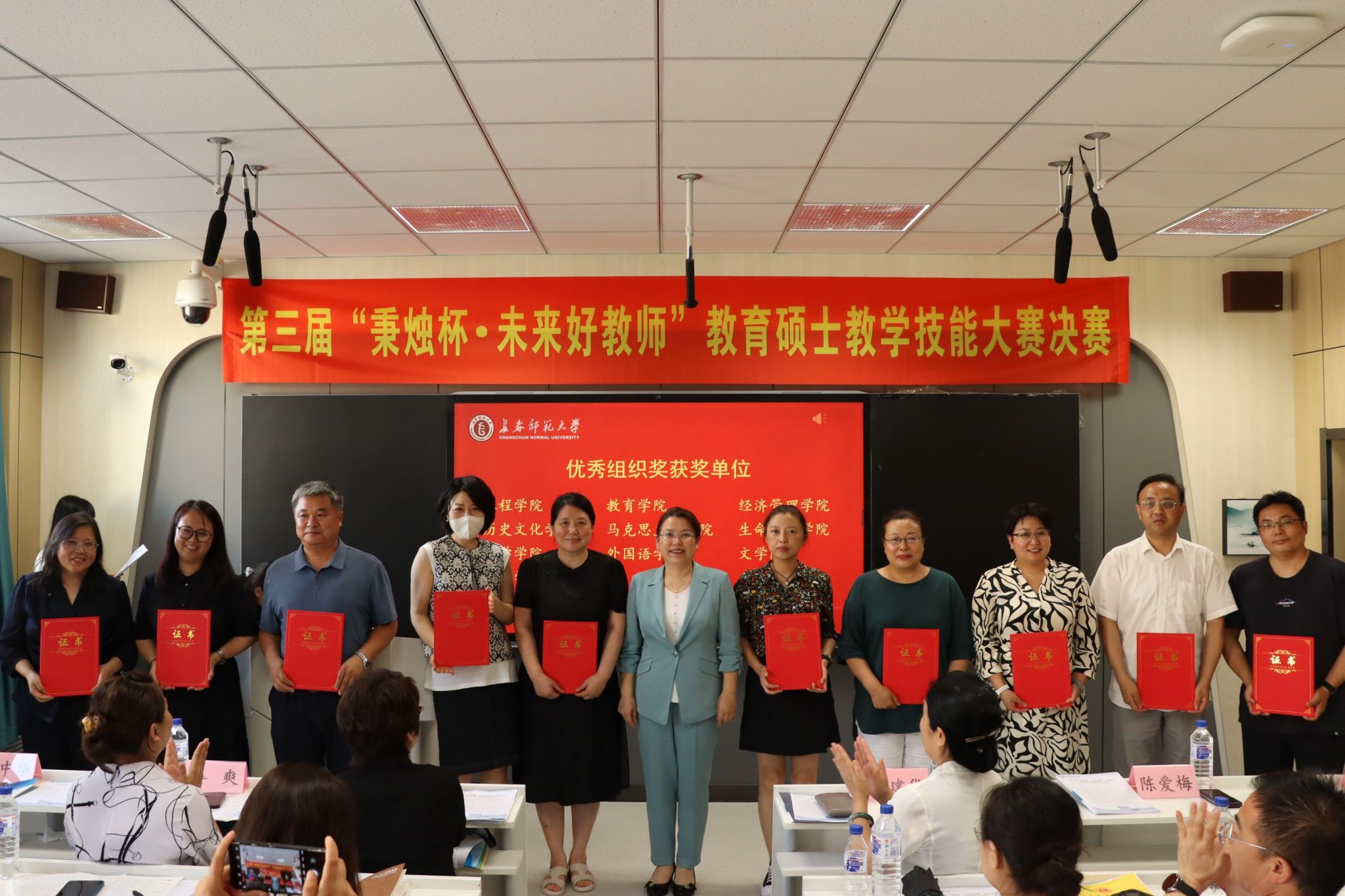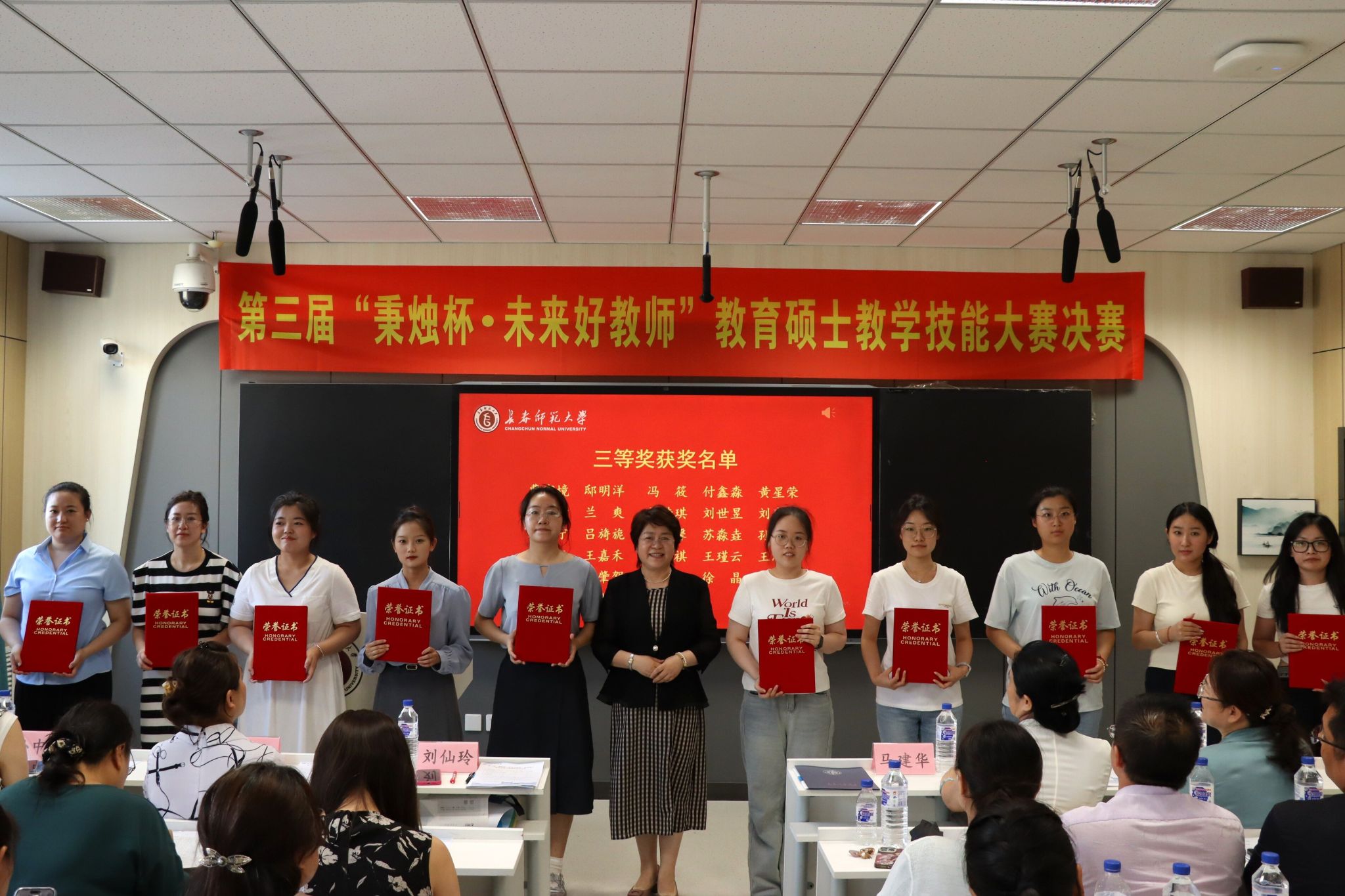 7月3日,由研究生院主办,各教育硕士培养单位协办的第三届“秉烛杯·未来好教师”教育硕士教学技能大赛决赛在我校举行。副校长陈爱梅出席颁奖仪式并讲话。长春市养正高级中学校长杨凤桐、长春外国语学校副校长娄爽、长春职业技术学校副校长李曼、东北师范大学华蕴实验学校副校长刘仙玲等专家代表,评委团专家,各学院代表、指导教师代表和研究生院全体人员共160余人到场观摩。